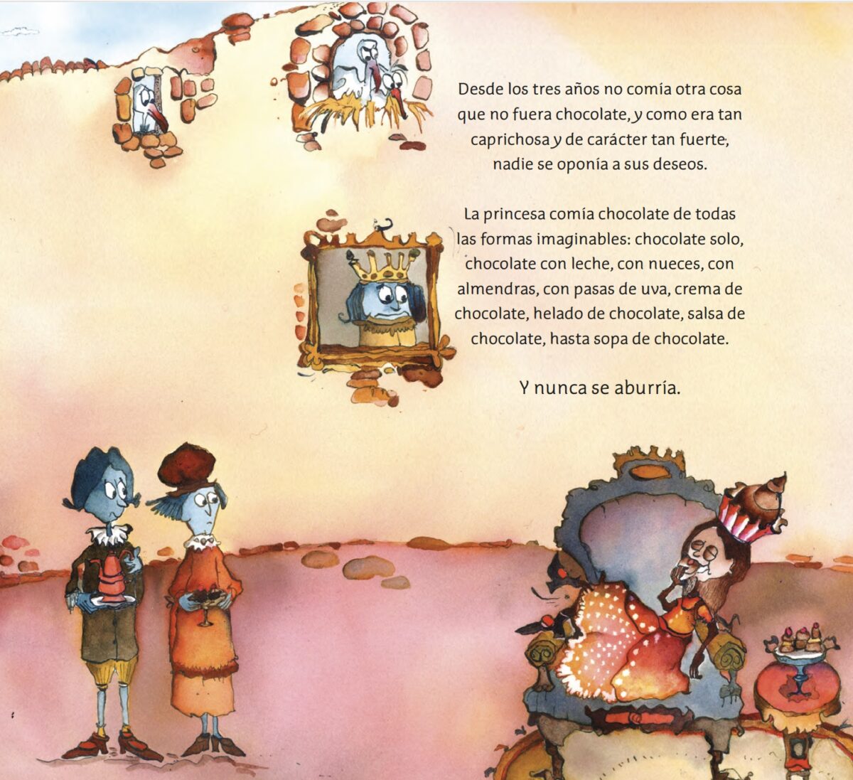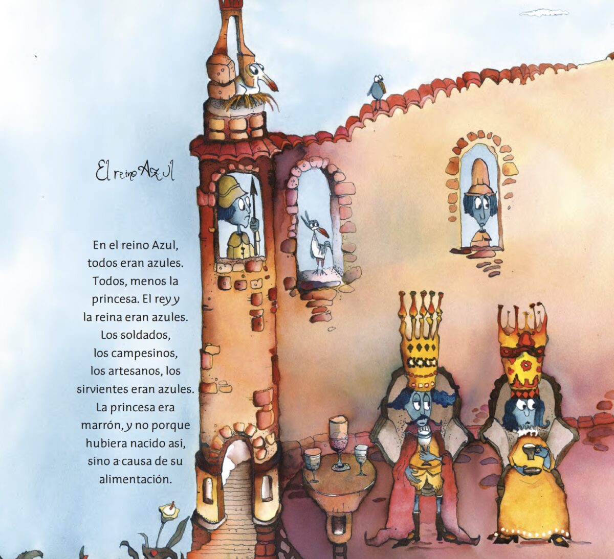 En el reino Azul todos eran azules, menos la princesa, que se volvió marrón de tanto comer chocolate. Y en el reino Rosado todos eran rosados, menos el príncipe, que de tanto comer postres con vainilla se puso de color amarillo clarito. Ellos, felices con su color, pero los demás… Los demás, no tanto. A los azules sólo le gustaban los azules, y a los rosados, los rosados. ¿Quién se iba a enamorar, entonces, del príncipe y de la princesa…?