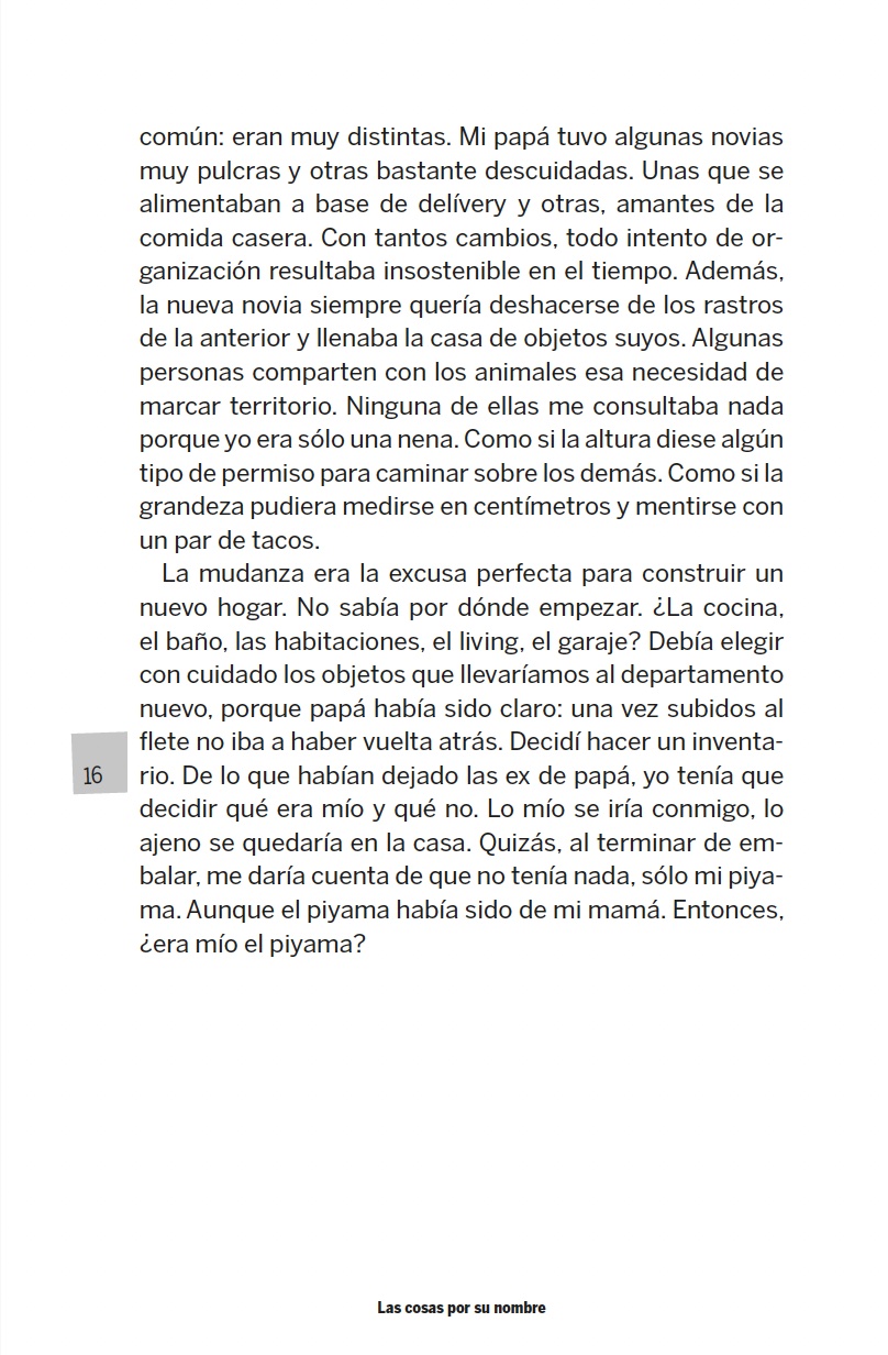 La voz de una joven surge potente en cada página a medida que relata sus días de niña en la casa paterna y la convivencia con las incontables novias que tuvo su padre. El relato se inicia con los preparativos de una mudanza y la tarea de la niña de decidir qué se queda en la casa y qué se muda con ellos. Cada decisión será una toma de conciencia sobre la vida de ambos.