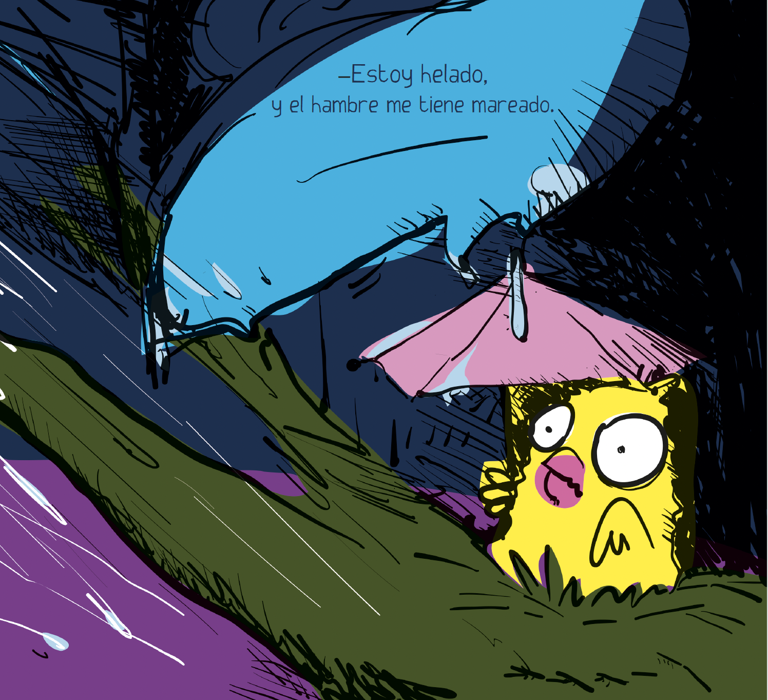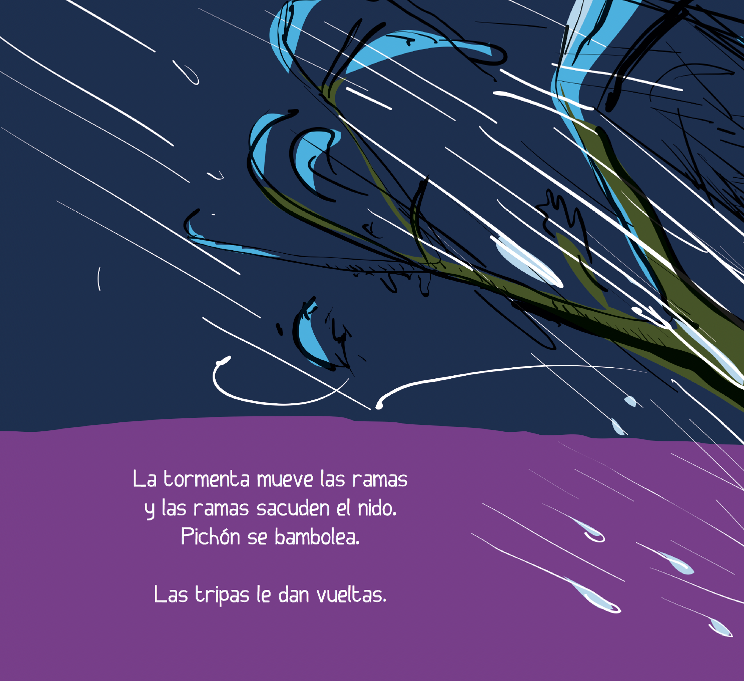 Pichón se cayó del nido: mojado,embarrado… se siente solo y muy triste. Hasta que al fin descubre que a veces,de la manera menos esperada,se puede recibir una muestra de amor.