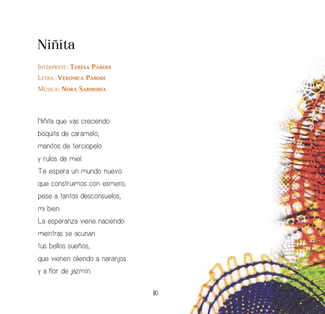 Bordando nanas , Tarareando y Abrazo Guardado son sus libros discos editados por Del Naranjo con sus canciones interpretadas por León Gieco, Teresa Parodi, Liliana Herrero, Víctor Heredia, Pedro Aznar, Ana Prada, Pim Pau, Luna Monti, Vuelta Canela, Dúo Karma, Cecilia Todd, Chango Spasiuk, Chiqui Ledesma , Emilia Parodi, y por ella misma.
